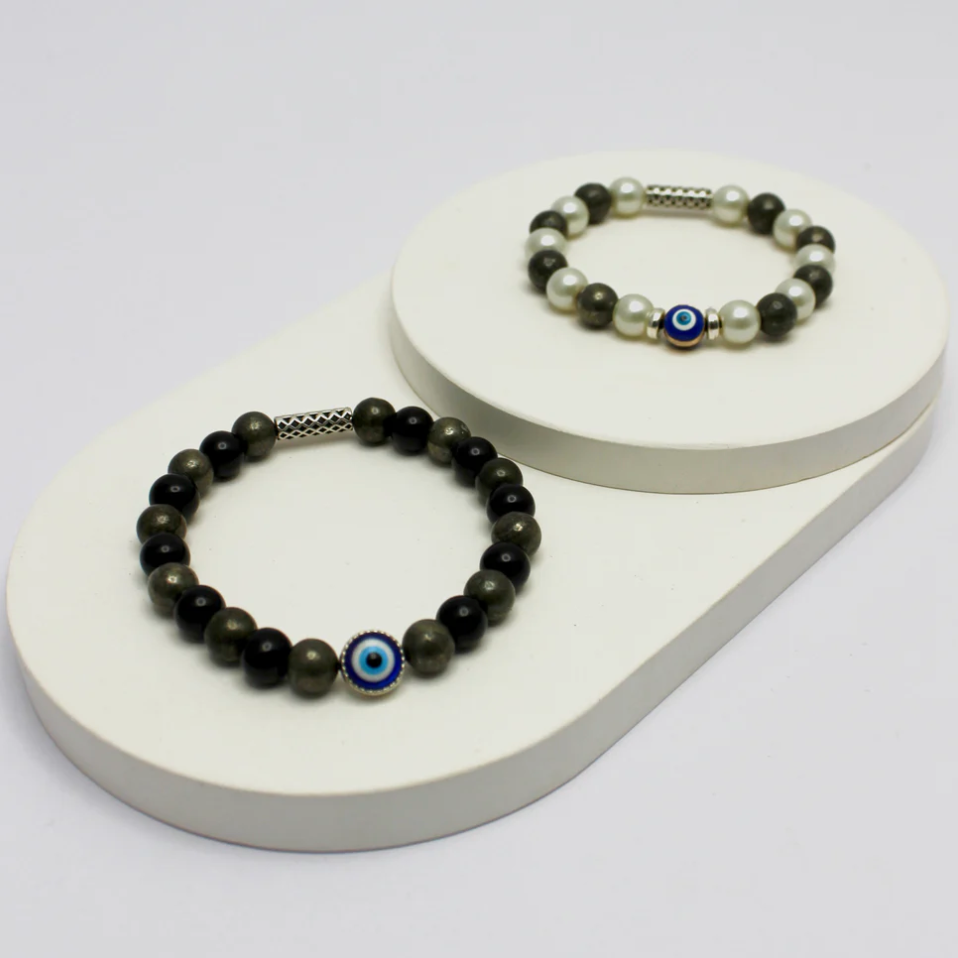 • The female bracelet features calming white onyx stones, symbolizing purity and harmony
