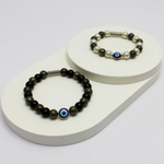 • While the male bracelet boasts bold black onyx, representing strength and resilience