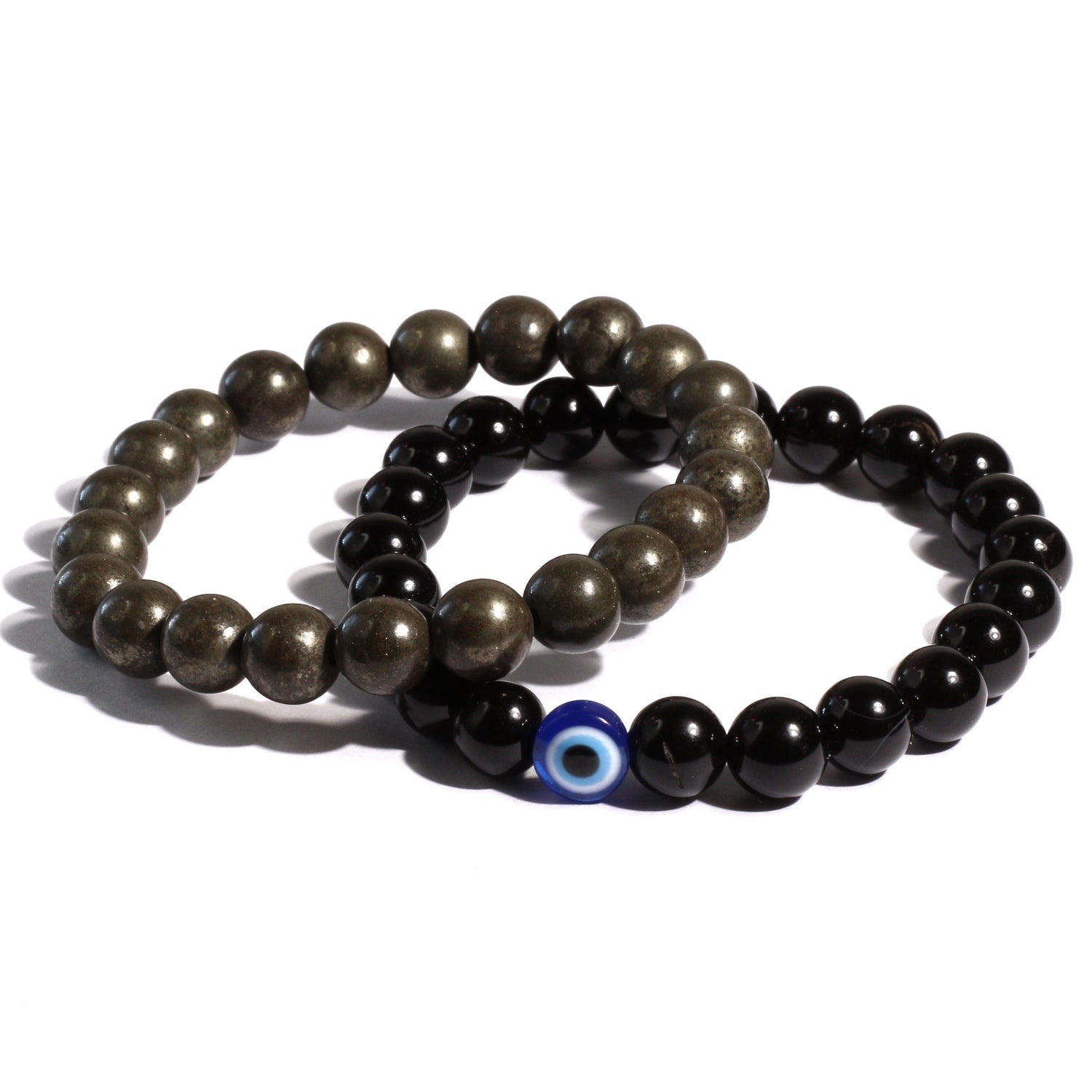 Paired perfectly with the Pyrite Bracelet, our Black Onyx Evil Eye Bracelet offers powerful protection. The striking combination of Black Onyx and the iconic Evil Eye symbol shields you and your finances from negative energies and malicious intentions. Black Onyx, renowned for its grounding properties, works in harmony with the Evil Eye charm to create a protective barrier, ensuring your wealth remains safe and secure.