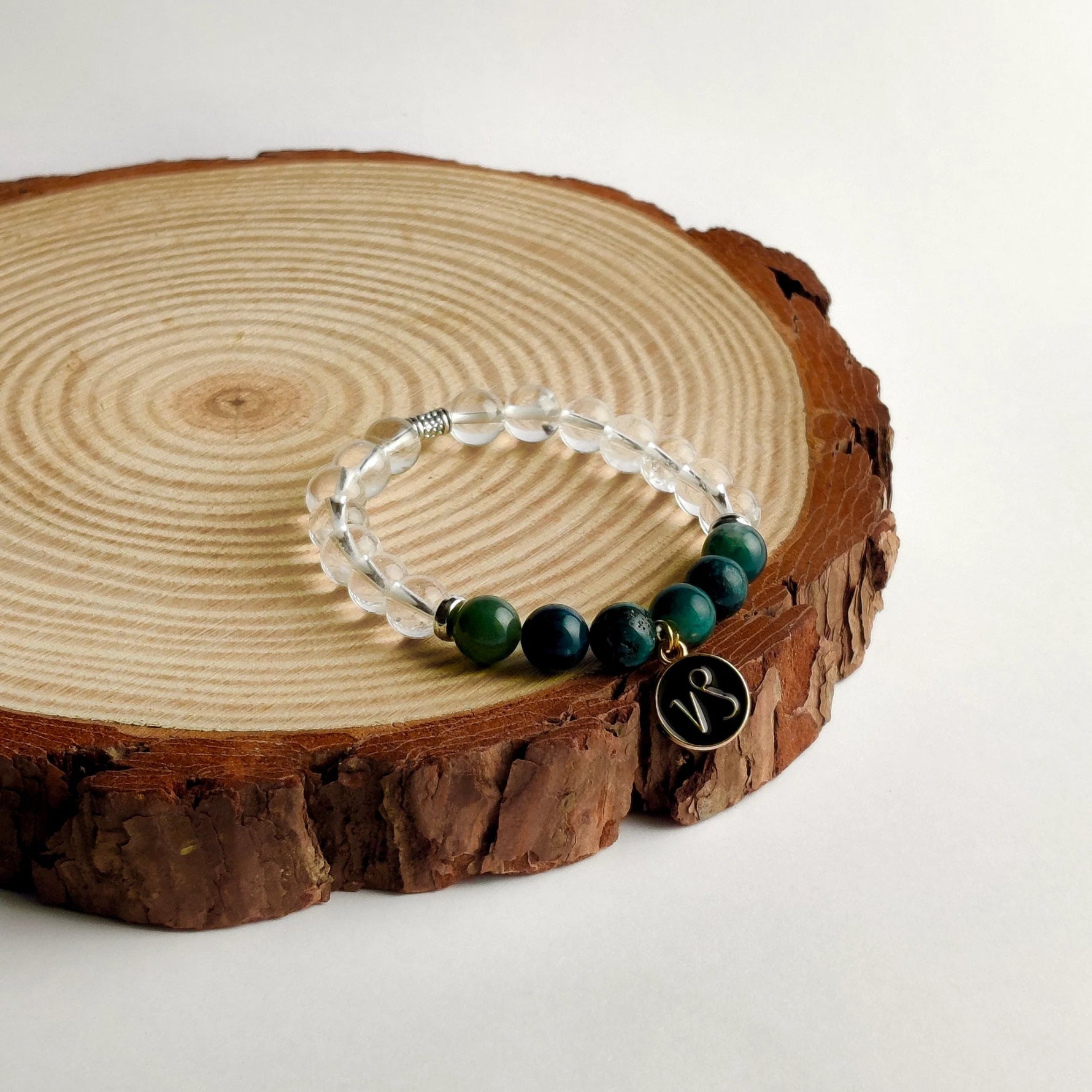 Clear Quartz and Moss Agate synergise to support Capricorns in various aspects of their lives. Clear Quartz amplifies clarity and focus, essential for Capricorn's ambitious pursuits and practical decision-making. It enhances organizational skills and aids in goal manifestation, empowering Capricorns to achieve their aspirations with precision. Moss Agate, with its grounding and stabilizing energy, fosters a deep connection to nature, nurturing Capricorn's earthy essence and enhancing their resilience in times of challenge. Together, these stones promote balance, prosperity, and growth, serving as a steadfast companion on Capricorn's journey towards success and fulfillment.